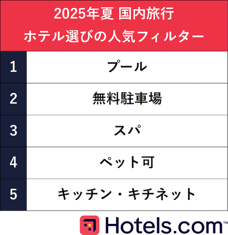 今年の夏の国内旅行のホテルを検索しているユーザーが最も多く使用したフィルター*4を見てみると、1位には夏休みの旅行には欠かせない「プール」。また、2位には「無料駐車場」、5位には「キッチン・キチネット」がランクインしており、昨今の物価高を考慮して、移動や食事の費用を抑えようと考えている人が多いことが伺えます。
