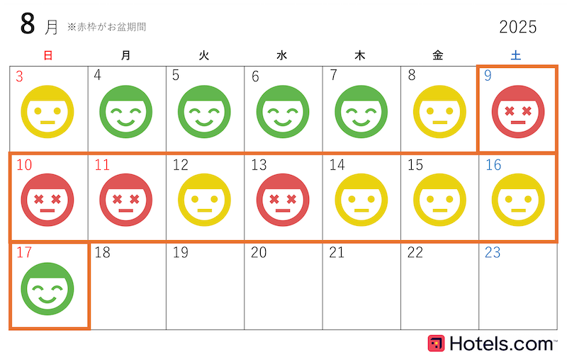 最大9連休となる今年のお盆。お盆前の2025年8月3日(日)から8月17日(日)のお盆期間のうち、Hotels.comのホテル宿泊検索データ によると、8月9日(土)から8月11日(月・祝)、そして8月13日(水)が特に混雑すると予想されます。期間中、最も混雑が少ないと考えられる8月17日(日)に比べて、最も混雑が予想される8月9日(土)は3倍以上混雑する可能性があります。お盆の連休に合わせて、有給休暇を取得できる場合は、8月4日(月)から8月7日(木)の間の旅行、もしくは8月17日(日)以降の、混雑を避けた旅行をおすすめします。
