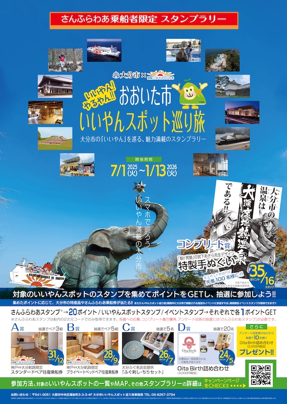 フェリーさんふらわあ船内(大阪~別府/神戸~大分航路)および大分市の観光スポット等(全16か所)を周遊するデジタルスタンプラリーを開催します。