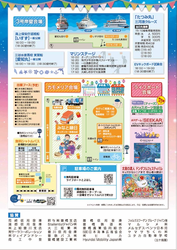 当イベントは毎年、港に親しみ、港湾について理解を深めるための機会として開かれ、会場は豊橋市神野ふ頭町のポートインフォメーションセンター「カモメリア」一帯です。イベント全体としては午後4時から午後9時までとなりますが、船舶の一般公開を含めた岸壁会場は午後7時までです。