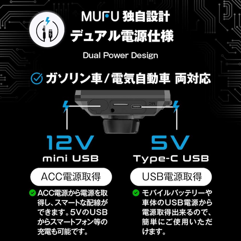 12V/5Vの両対応電源で、USB電源(5V)とバイク搭載バッテリー(12V)に両対応。