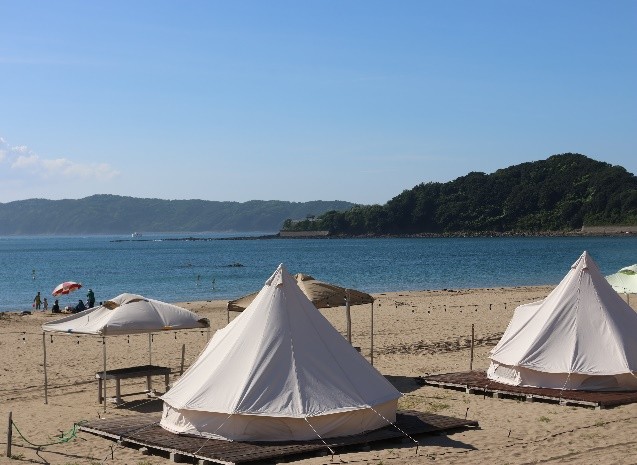 遠浅で波の穏やかな天然砂浜のビーチ。家族でバーベキューやグランピングが楽しめる家族向けの海水浴場です。