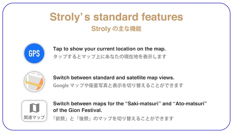 また、GPSと連動させることで「自分の現在地」が分かるため、山鉾巡りに役立てることができるほか、「祇園祭前祭絵地図」と「祇園祭後祭絵地図」の切り替えや、日本語、英語、韓国語の3言語にも対応。海外からの観光客などにも使ってもらえるイラストデジタルマップとなっています。さらに今年は、山鉾スポットに関連Youtube動画を追加したほか、過去に撮影したパノラマ画像を日本語にも追加しています。