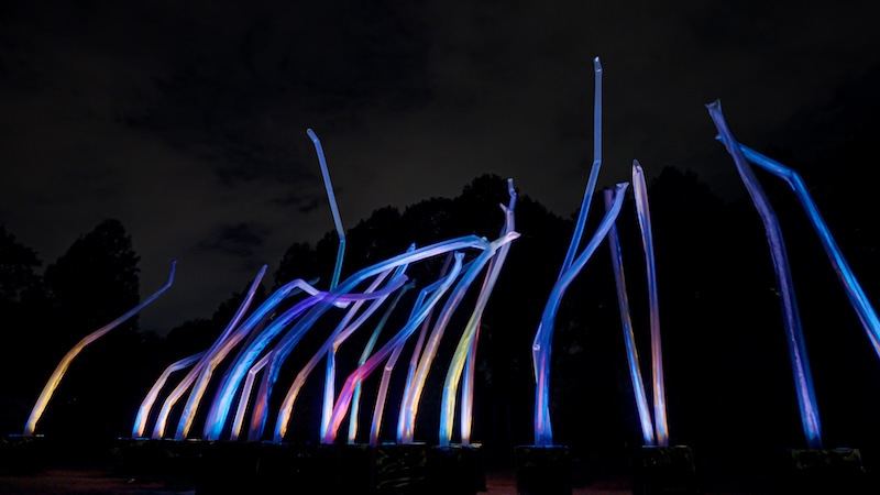 また、《光色の草原 – カピラリス》の作品エリアが拡張されました。カピラリスの光は、人々が近くで立ち止まると、さらに強く輝き、音色を響かせます。そして、その光は、周辺のカピラリスへ伝播し、音色を響かせながら、連続していきます。