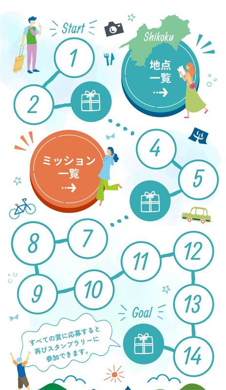今回、その一環として四国地域の飲食店、観光施設を巡る「四国巡りんく」を7月18日(金)~12月31日(水)に開催します。各地の対象店舗、対象施設を巡るスタンプラリー形式のイベントで、スマートフォンで獲得したスタンプ数によって素敵な賞品を抽選でプレゼントします。