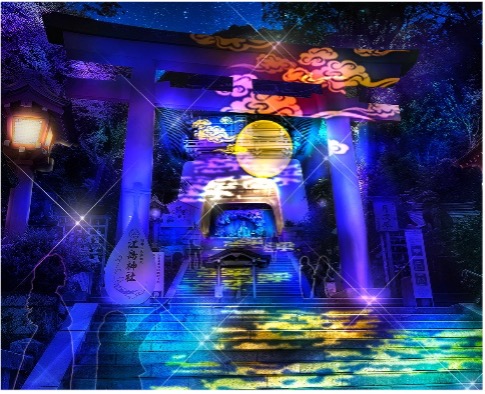 会期開始の7月19日(土)からの第1期は、瑞心門を中心に光の切り絵のモチーフが映し出され、涼を呼ぶ音も加えた演出に。今年は新たなモチーフとして、昔も今も変わらず江の島を照らす「夏の宵月」が加わり、さらに華やかさを増しています。