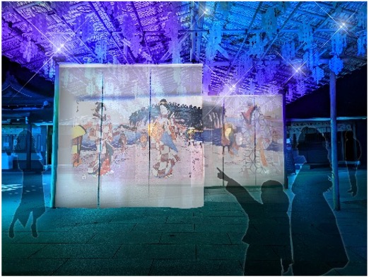 7月27日(日)からの第2期では、瑞心門から“光の導き”を煌めきで表現した石段を昇りきった辺津宮において、本殿へ向かう通路にかかる葦簀(よしず)の下で貝細工の風鈴が涼やかな音を鳴らす中、羽衣のようなゆらめく布に江の島を舞台とした浮世絵の作品たちが映し出されます。いにしえからこの地の文化を育んできた江の島の魅力を表現する、幻想的な空間を体験いただけます。