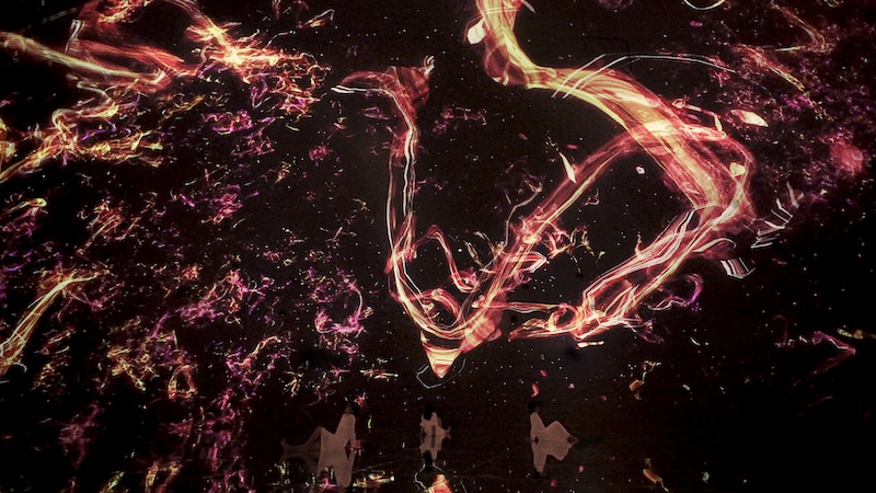無限のごとく広がる空間に永遠に書が書かれ続け、書のそれぞれの位置からその字の音が響き、それらが連なった朗唱が響き続ける。