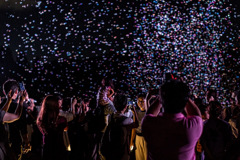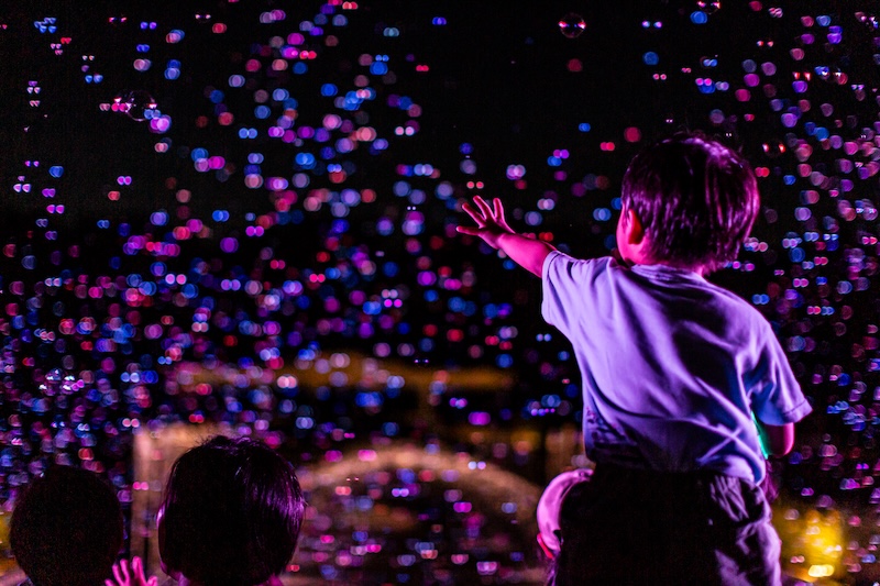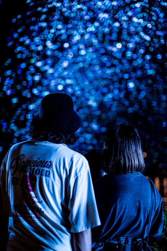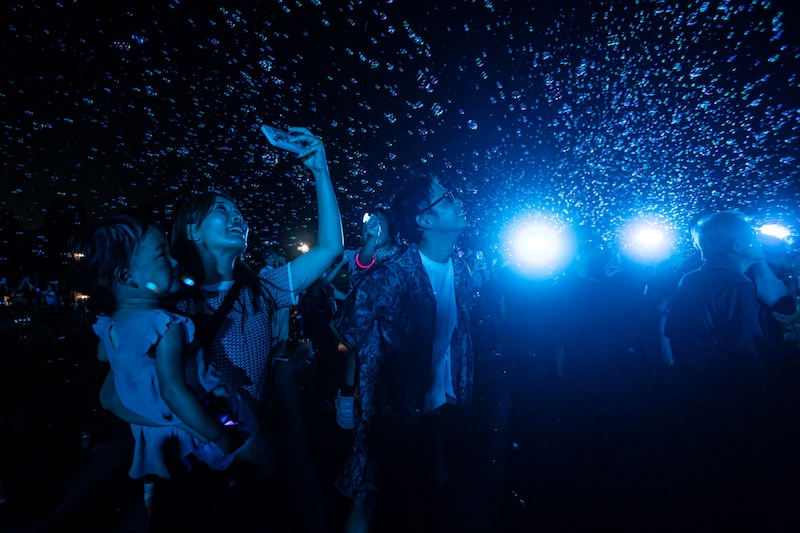 「バブルミネーション」はOUTDOOR THEATER JAPANが提供する夜空を劇場化するプロジェクト。⾃然に還るサスティナブルなシャボン⽟を夜空に舞い上げ、光り輝く空間を作り上げる体験イベントです。