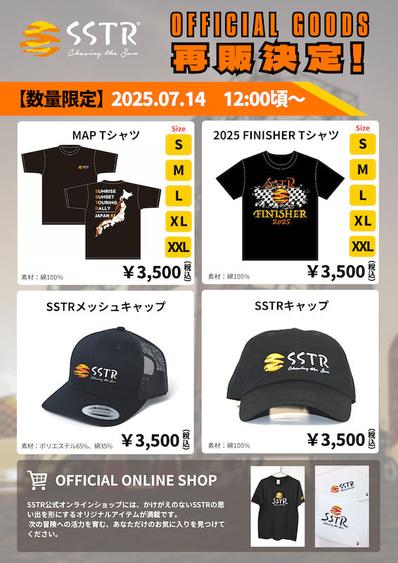 SSTR運営委員会(本社:東京・渋谷区、代表:風間深志)は、去る2025年5月24日(土)から6月1日(日)に開催されたSSTR2025(サンライズ・サンセット・ツーリング・ラリー2025)にて千里浜なぎさドライブウェイ終点特設会場で販売され、大変ご好評のうちに完売となっていたSSTRオリジナルグッズの一部を、2025年7月14日(月)12:00頃よりSSTR公式オンラインショップにて再販することを決定いたしました。