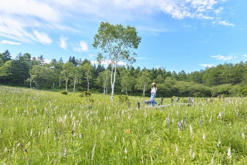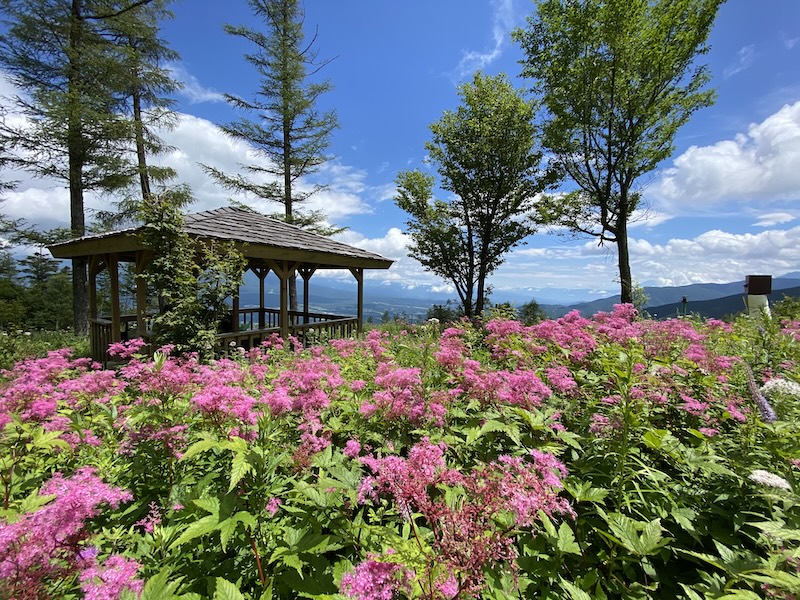 標高1,780mの富士見パノラマリゾート山頂は、7〜8月でも平均気温22℃ほどと涼しく、街中とは別世界の心地よさ。 木々のトンネルや木道、草原を通り抜ける風は、まるで自然の呼吸のように静かに、やさしく肌をなでます。 そんな涼しさの中に広がるのが、色とりどりの高原の植物たち。