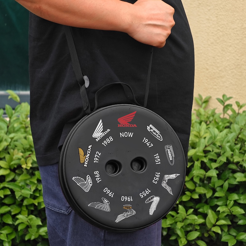 1953年から現在に至るまで、Hondaの歴代ウィングロゴの変遷を一面にあしらった折り畳みスツールは本田技研工業の正式ライセンスを取得した公認アイテム。