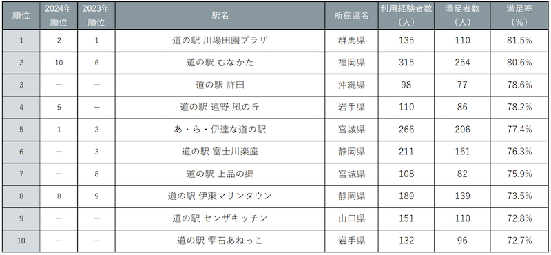 株式会社リクルート(本社:東京都千代田区、代表取締役社長:牛田 圭一、以下リクルート)が発行する旅行情報サイト『じゃらんニュース』は「道の駅」に関するアンケート調査を実施しました。高い支持を誇る群馬県「道の駅 川場田園プラザ」が1位を獲得したほか、2025年は福岡県「道の駅 むなかた」が大幅に順位を上げ、沖縄県からも初ランクインする結果となりました。ランキング結果とともに、上位5位にランクインした道の駅の概要を紹介します。昨年に引き続き今年も「もう一度利用したい」「今後利用してみたい」ランキングも発表。なお、本内容は『じゃらんニュース』でも紹介しております。