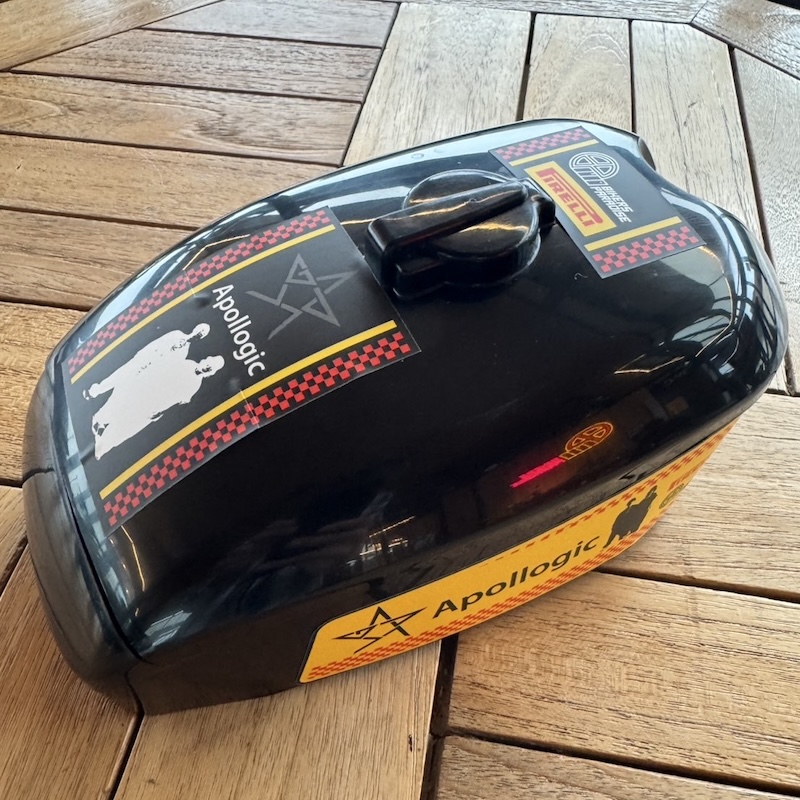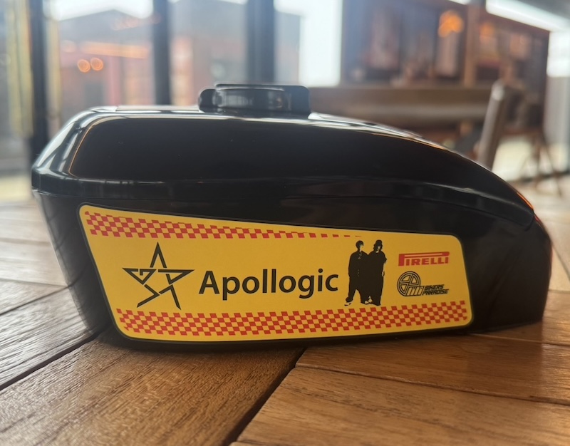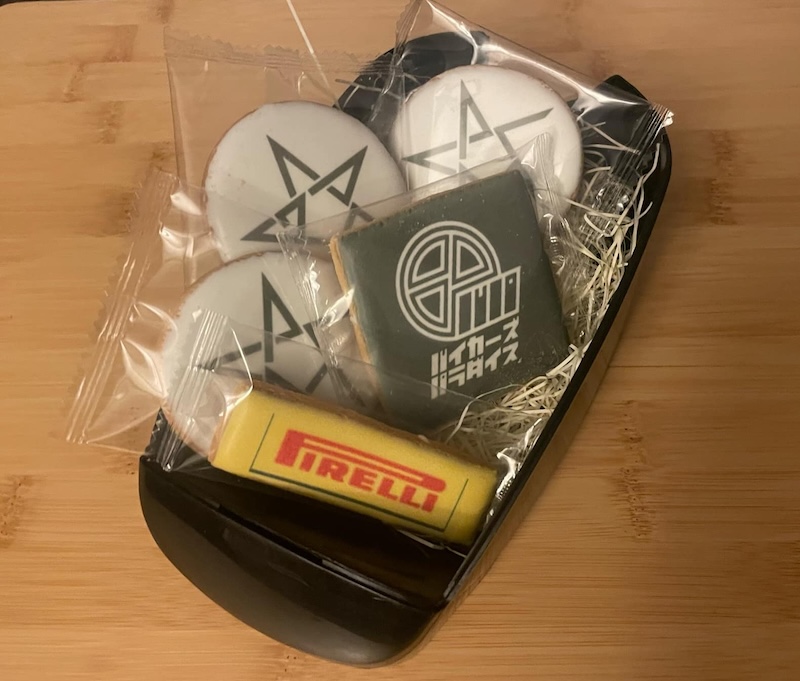 バイクのタンクを模ったBIKE BENTOにアポロジックのスターマーク、ピレリ、バイカーズパラダイスのロゴをプリントしたクッキーを入れました。