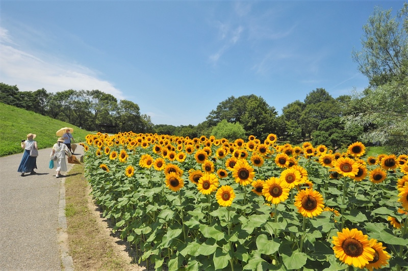 まんのう公園では7月旬ごろにかけて、園内の青竜の谷にてひまわりの花畑をお楽しみいただけます。