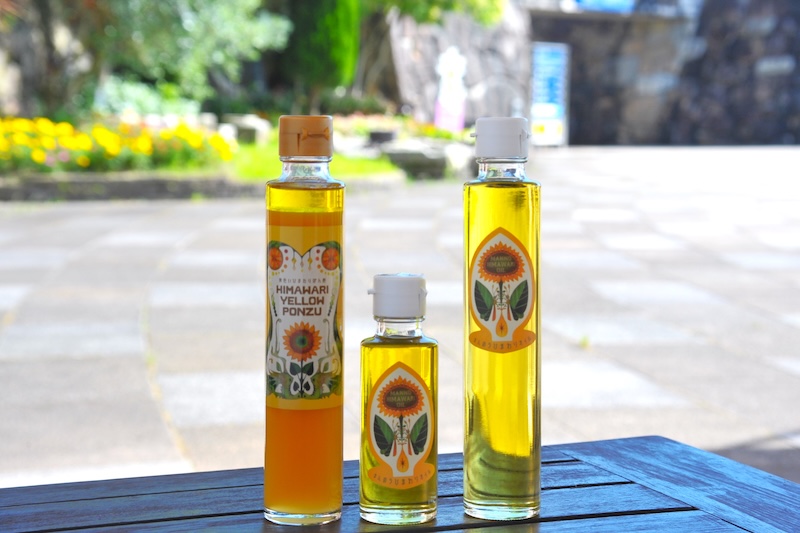 原料にまんのう町産のひまわりの種を100%使用したひまわりオイルや、ひまわりオイルを配合したひまわりぽん酢の他、ひまわりの種から作った国内でも珍しいひまわり焼酎なども販売しています。贈り物にもピッタリなおしゃれなデザインが好評です。お土産やプレゼントとしていかがですか。