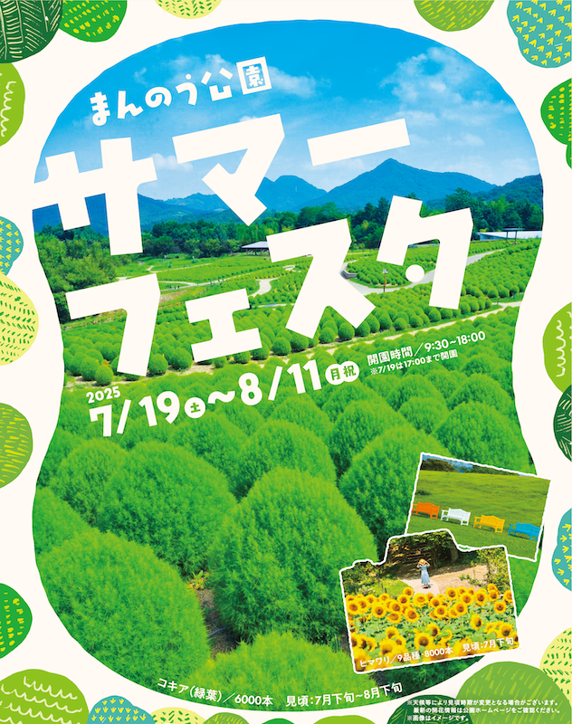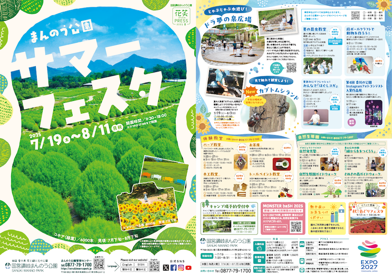 7/19(土)~8/11(月祝)の期間、香川県仲多度郡まんのう町にある国営讃岐まんのう公園にて、夏休みのお出かけにぴったりのイベントが盛りだくさんの「サマーフェスタ」を開催します。