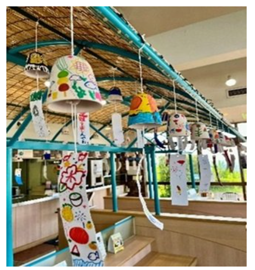 地元小学校やこども園の皆さんが作成した風鈴や七夕飾りを展示します。