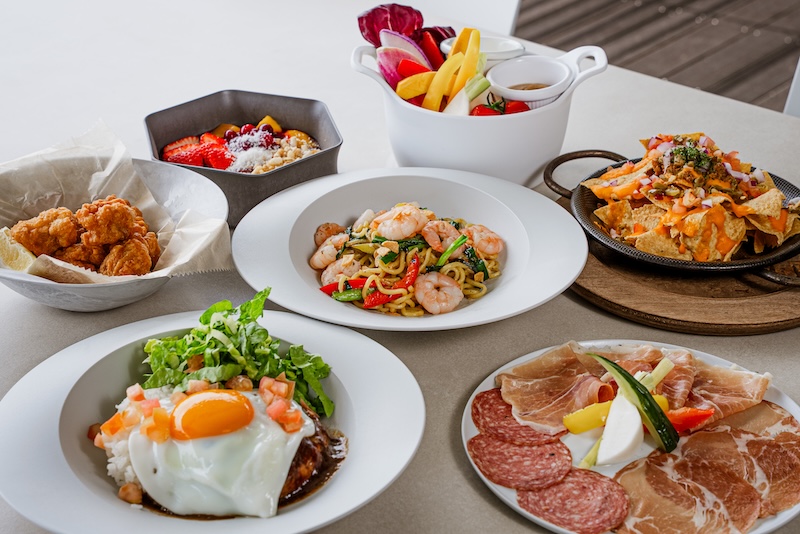 海を眺めながらお楽しみいただける、バリエーション豊かなフード&ドリンクメニューをご用意します。「フレンチフライ」「カラマリフリット」などカジュアルにつまめるフィンガーフードから、「ガーリックシュリンプ塩焼きそば」「タコライス」などお腹を満たす一皿まで。夏らしいフレッシュなカクテルやシャンパンなどとともにご堪能ください。