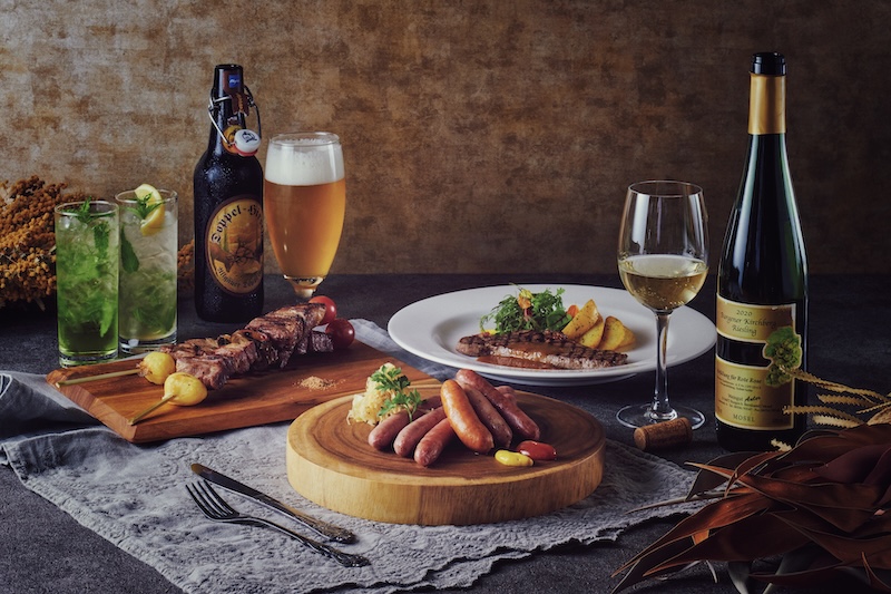 神戸ガーデンテラスバーを取り囲む古城(建物)や空間は、ドイツの古城「ヴァルトブルク城」をモチーフにしていることから、ハーブ園ならではの夏限定ドリンク「布引モヒート」を筆頭に、本場ドイツの醸造所のビールや神戸・北野の老舗ワインハウス「ローテ・ローゼ」がおすすめするワインをスパークリングから白、赤ワイン、デザートワイン、キンダーワイン(ワインになる前のぶどうジュース)と多彩に取り揃えています。ドリンクと相性抜群のフードとあわせて特別な夏のひとときをお過ごしください