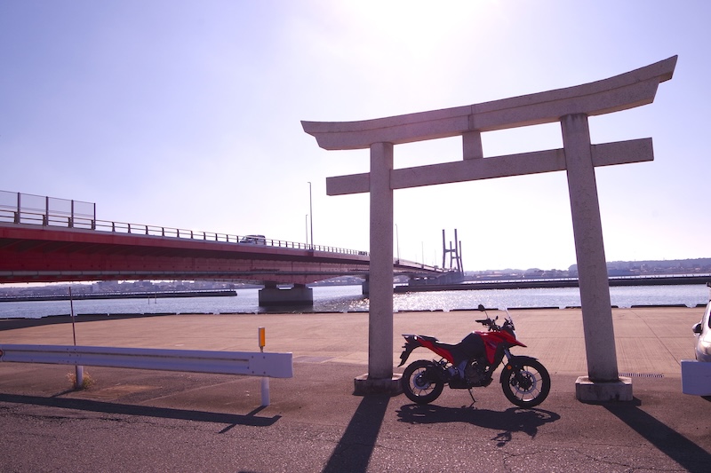 さて、利根川の中洲の道だが、信号皆無で車通りも少なく、9キロほどだがバイクで走るのが気持ちの良い爽快路だ。中洲の突き当たりで利根川河口堰を渡り国道124号線に入り、銚子大橋へと向かう。そして銚子大橋を渡る直前で国道を下りて旧波崎漁港に着。この漁港では手子后神社鳥居越しに銚子大橋を望むことが出来る。ここから波崎新港までは利根川の河口沿いを走るが、キラキラと水面が光り走っていて気持ちが良い。