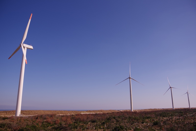 海岸線には12基の風力発電用の大型風車が立ち、その総年間発電量は約3500万kw。なんと一般家庭の約1万世帯分にも相当する。