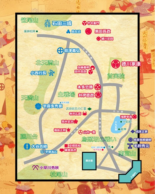 関ヶ原合戦を再現したテーマパーク型資料館です。約 30,000 ㎡の敷地内に、コンクリート像作家:浅野祥雲作の極彩色のコンクリート製等身大武将像を、史実にもとづき、豊臣軍と徳川軍の陣地に配置しています。屋外展示のほか、参加型ゲーム、関ヶ原合戦屏風を展示する資料館もあります。