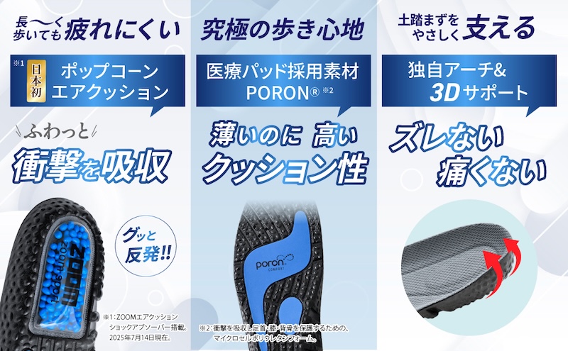 当商品は、優れた衝撃吸収性を実現したポップコーンエアクッションを日本で初めて(※1)採用したインソールです。