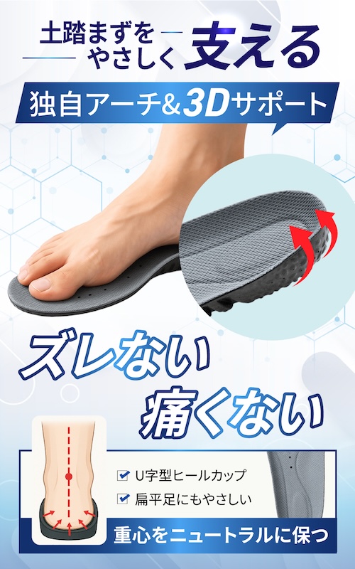③独自のアーチサポートが土踏まずを支え、扁平足や足裏痛をケア。ランニングや立ち仕事の姿勢をサポートします。