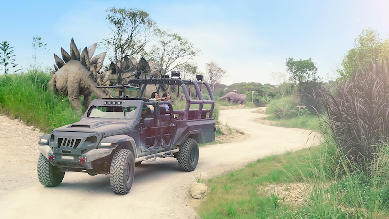 巨大危険生物が施設を破壊し脱走⁉ 状況確認・事態制圧のミッションを負って、熟練ドライバーが運転する12人乗り装甲車に乗り込んで向かった先は、20頭もの恐竜がいる生息地。壮大なジャングルの木々よりもはるかに大きい約19m(ビル5階建て相当)の巨大なブラキオサウルスなどに遭遇しながらジャングルの奥深くへ進んでいくと・・・。何が起こるかわからない、ハラハラドキドキの極限の大興奮が。 体験時間 :約17分