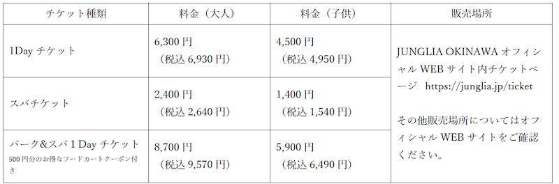 ※上記は国内在住者の料金です。非国内在住者向け一般料金に関する料金および販売場所は、JUNGLIA OKINAWAオフィシャルWEBサイトをご確認ください。