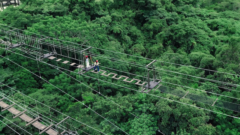 高さ約18mの巨大な4人用ブランコに乗ったら、後ろ向きに引かれみるみる上昇。自身のタイミングで風を切って高速でスウィング。見える景色ジャングルから、晴れやかな壮大な空の青へと変わります。