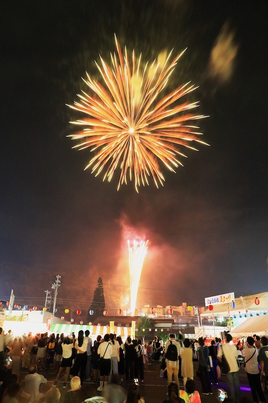 フィナーレを飾る打ち上げ花火は、高山市の地元花火師が手がける大玉花火。会場対面にある中学校のグラウンドから打ち上げられ、体に響く音とともに、満点の夜空を彩ります。
