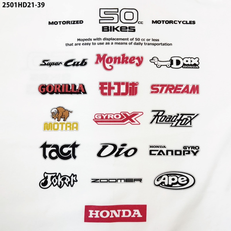長年にわたり日本の原付文化を築いてきた50ccバイク。その歴史が一区切りを迎える今、CAMSHOP.JPではノリモノ雑貨ブランドとして、Hondaのオフィシャルライセンスを取得のうえ、伝説的なモデルたちを称える記念アイテムとして本Tシャツを企画しました。
