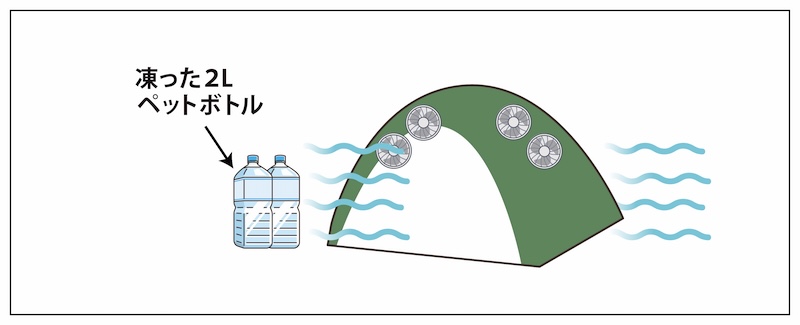 今回スタッフは、暑さ対策として「充電式の扇風機」と「凍らせたペットボトル」を活用。扇風機はテント内に吊るし、ペットボトルは入口付近に置いてひんやりした空気を作りました。