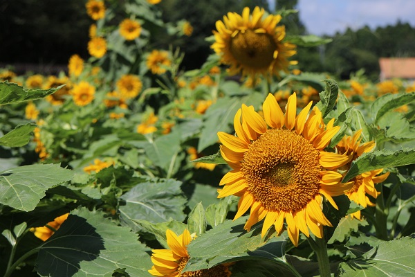 こちらの品種は小ぶりで草丈は低めですが、1つの株にいくつもの花をつけるため非常に華やかな印象を与えます。また長く咲くため、8月を過ぎてもお楽しみいただけます。撮影用の通路を設けていますので、ひまわりに囲まれた写真を撮影することができます。