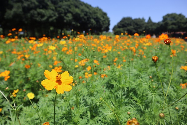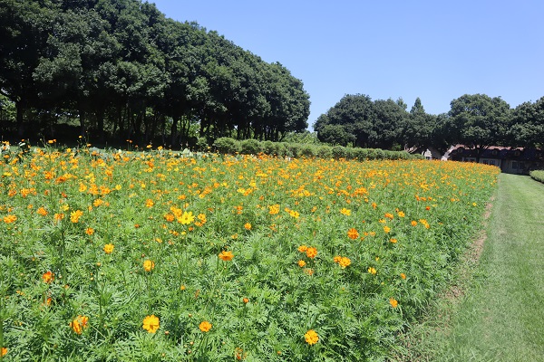 ひまわりに隣接する合計800㎡の畑では、キバナコスモスが開花を始めています。9月中旬まで美しいオレンジ色の絨毯が広がります。