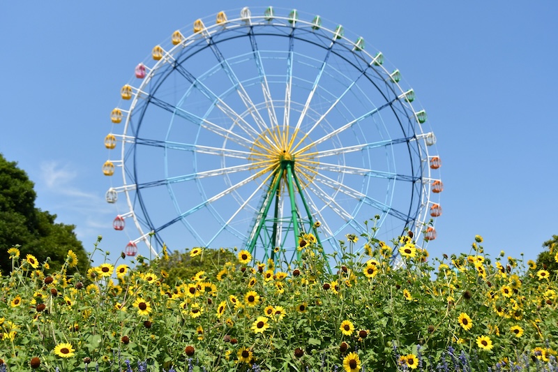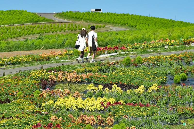みはらしの丘では、爽やかなライムグリーンのコキアが成長中。現在は約50~60cmほどに育ち、今後は“ふわふわ”とした大きく丸い形状で約70cmまでに成長します。また、丘の第1頂上入口にある「ウェルカムガーデン」では、色とりどりの草花が来園者をお出迎え。夏空に映える、華やかで明るい景色が楽しめます。みはらしの里に植栽されているヒマワリは、現在つぼみの状態が多く、場所によっては咲き始めている花もあります。