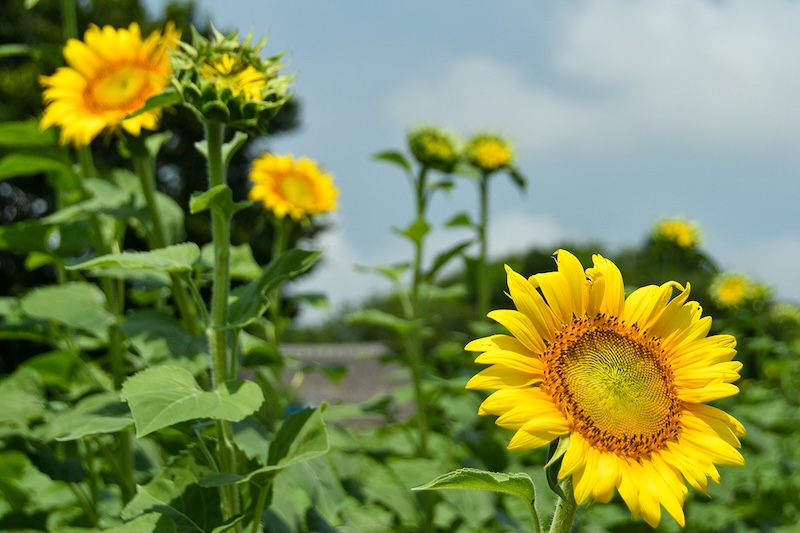 園内各所では、明るい黄色の花びらが陽差しを受けて輝くヒマワリ“アポロン”が咲いています。品種名は太陽神「アポロン」に由来され、一般的なヒマワリよりも小ぶりで、次々と花を咲かせることが特徴です。小さい花壇から花畑まで植栽されており、散策の途中で出会えるのも楽しみのひとつです。