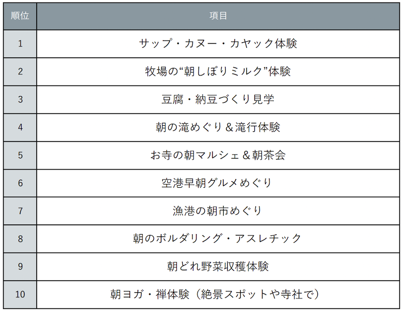 『じゃらん』ユニークな体験ができる朝活テーマランキング