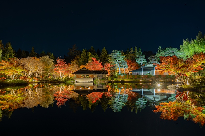 日本庭園やイチョウ並木をライトアップします。赤や黄色に色づいた木々が、園内を鮮やかに彩ります。