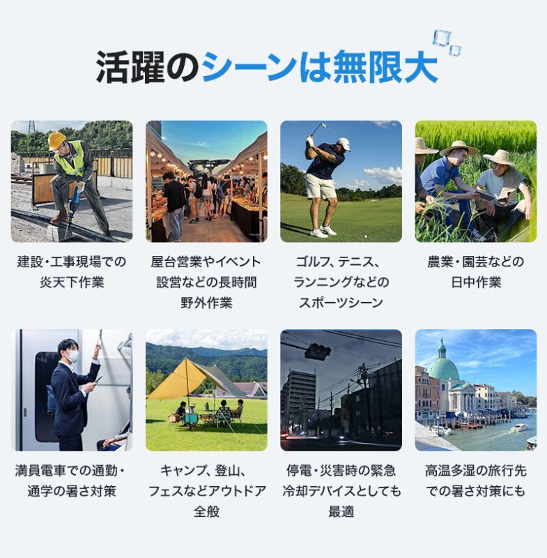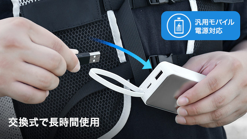 コンセントがない場所でも、お手持ちのバッテリーを挿すだけで即冷却スタート。