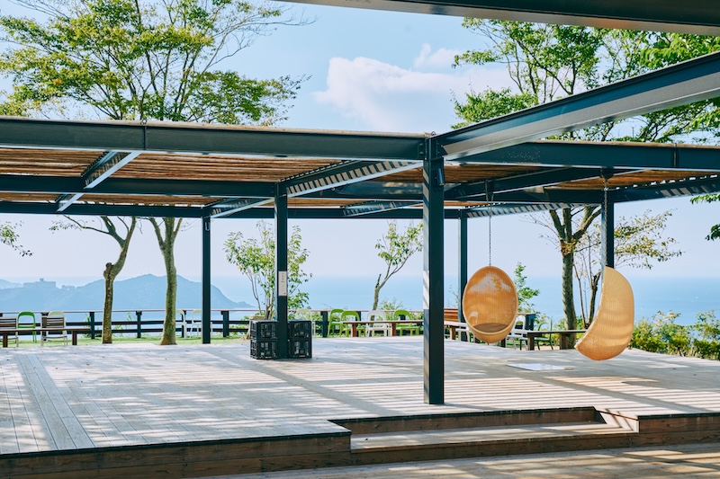 「淡路牛肉巻きハンバーグ 今日は肉の日」は、屋外店舗となっております。鳴門海峡の絶景を目の前に、椚座牛料理など淡路牛を使用したオリジナルメニューを堪能していただけます(空調のある室内イートインスペースも完備・屋外席はペット同伴可能)。