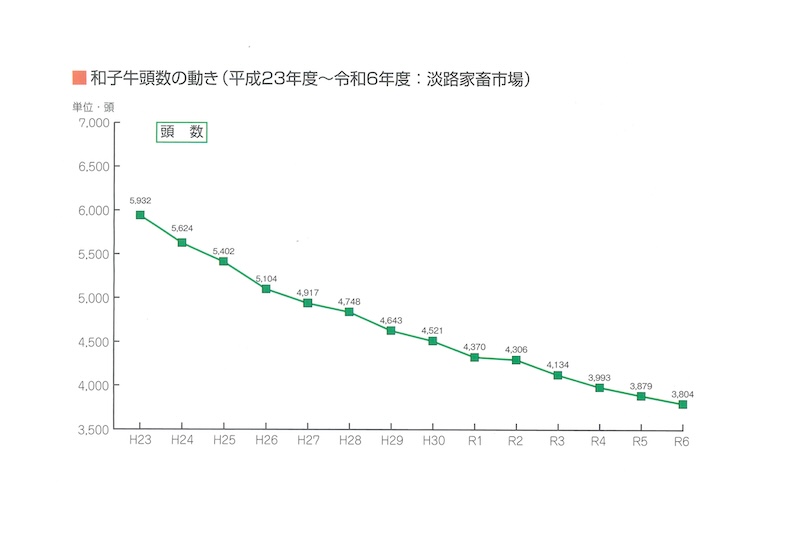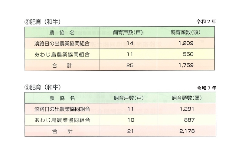 淡路島島内では、和牛子牛頭数が14年間で2,000頭以上が減少し、5年間で肥育農家が4戸・飼育頭数が400頭以上が減少しています。生き物と対峙する畜産農家は、休みが取りづらい労働環境、生産者の高齢化、担い手不足など多くの課題を抱えながら畜産農家を営んでいます。