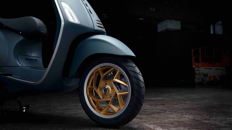 Officina 8のカラースキームは、レッグシールドのモールとヘッドライトおよびリアライトのトリムにはアルミニウムの質感を表現し、ステアリングコラムカバー通称“ネクタイ”にあるホーンのスリットと、ホイールのスポーク部分には真鍮をイメージしたペイント。そしてホイールのリム部分にはダイヤモンドカット仕上げが施されるなど、エレガントなサテン仕上げのボディーと、メタルを表現したアクセントが独創的なコントラストを生み出します。