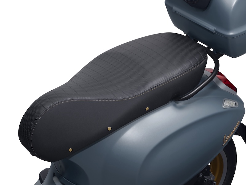 シートにはダブルステッチが施され、、2種類の材質を採用する表皮は磨かれた真鍮リベットの装飾など、そのきめ細やかな仕上げには伝統へのさらなる敬意を表しています。そしてGTVにはボディーと同色のシングルシートフェアリングを標準装備し、Vespaのレーシングモデルの外観を再現した独特なスタイリングを実現しています。さらにこれらの特別仕様車は、マットブラックで引き締まった数々のディティール同様に、マットブラック仕上げのバーエンドミラーによってスポーティな外観を強調します。