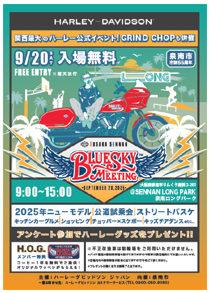 ハーレーダビッドソン ジャパン株式会社は、ライダー・ご家族連れ大歓迎の1Dayカルチャーイベント『BLUE SKY MEETING™ 大阪・泉南』を、9月20日(土)9:00~15:00に大阪府泉南市のSENNAN LONG PARK(泉南ロングパーク/泉南市りんくう南浜2-201)にて開催します。どなたも入場無料です。