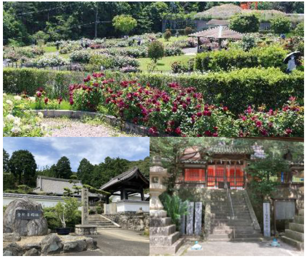 公園から和歌山方面に進むと、周辺にはデビッド・オースチン・ロージズ社が同社の本国英国以外で直接運営する唯一のローズガーデン(写真上)や、2024年に日本遺産「葛城修験」の構成文化財に追加認定された「金熊寺」(同左下)や「信達神社」(同右下)など、たくさんの見どころが皆様をお待ちしております。