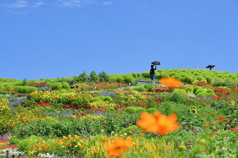 みはらしの丘へと続く、つづら状の園路を利用することで、まるで花畑の中に立っているような撮影が楽しめます。園路のカーブや高低差を活かして足元を隠すと、画面いっぱいに色とりどりの草花が広がります。家族や友人と一緒に、SNS映えする記念写真を撮影することができます。