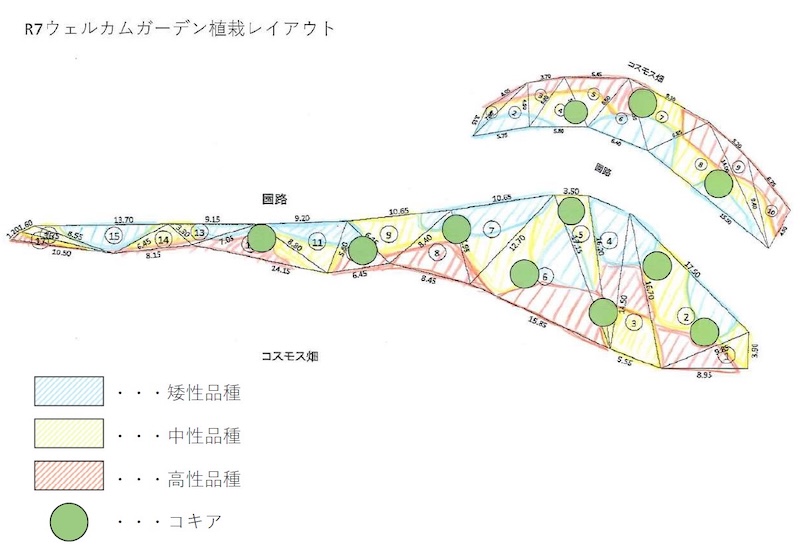 今年のウェルカムガーデンは、ナチュラルガーデンのように多様な品種が入り混じる「ブーケのようなデザイン」をイメージして植栽しています。ガーデン内には背の低い矮性品種、ほどよい高さの中性品種、存在感のある高性品種をバランスよく植えており、立体感のある奥行き豊かな花畑を演出しています。